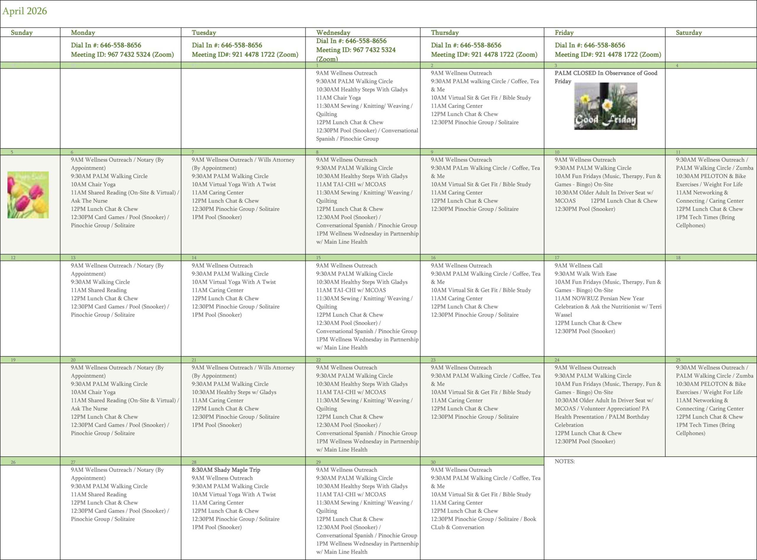 - Friday 4/24: PALM Volunteers Appreciation and Members Birthdays Celebration (10:30 am – 1:30 pm) PA Health Presentation 11:00 am – 12:00 pm