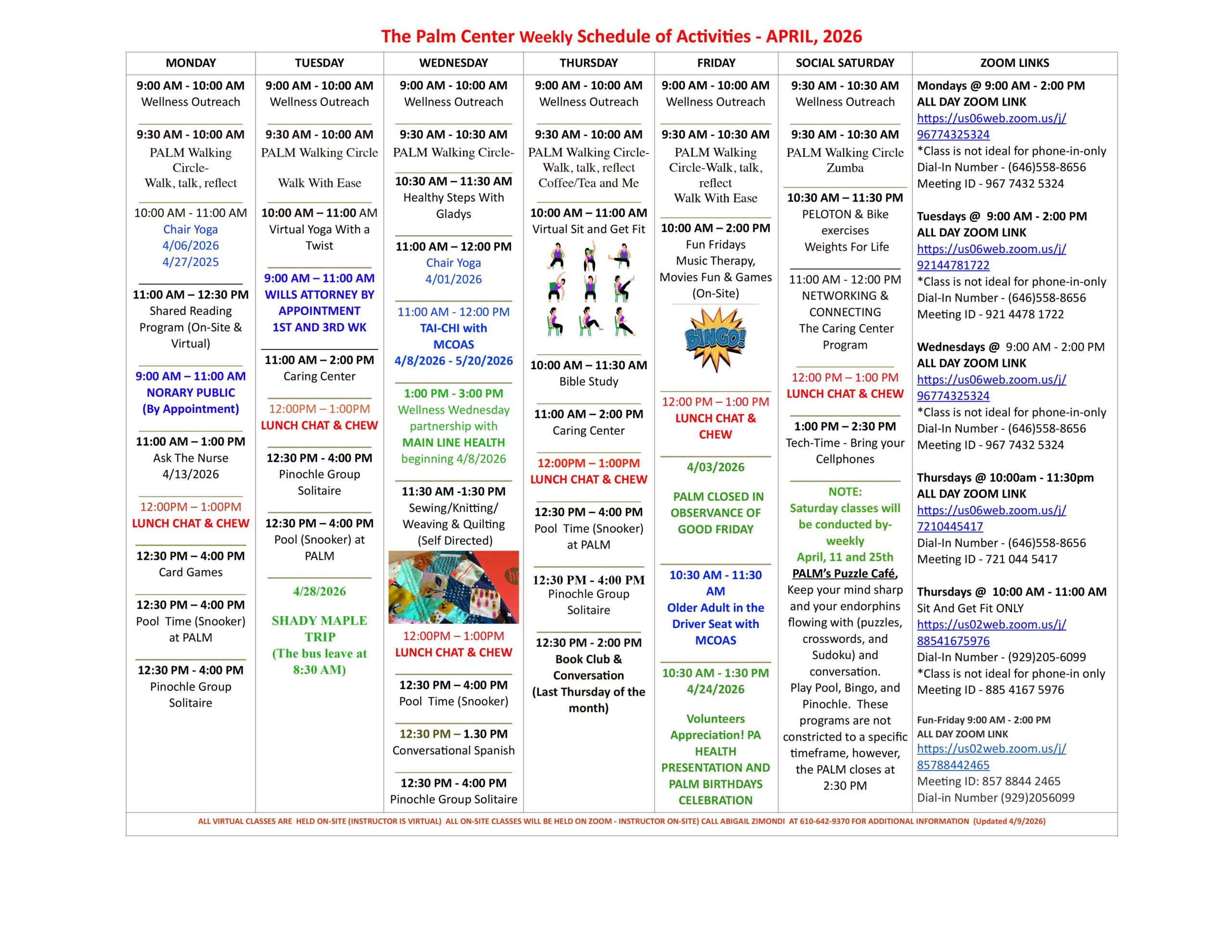 - Wednesday 4/15: TAI-CHI at PALM 11:00 AM